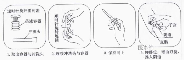 阴道用药。将冲洗头插入阴道内6-8厘米,用手挤容器,将药液送入阴道。每日早晚各一次,每次一支,用药后卧床5分钟。