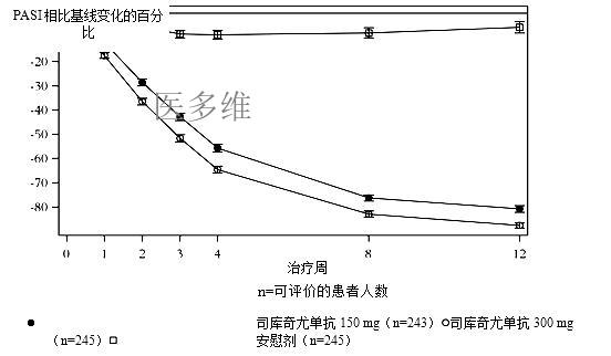将使用本品治疗斑块状银屑病的4项Ⅲ期安慰剂对照研究数据进行汇总,用于评价治疗12周的安全性。共对2,076例患者进行了评价,其中692例患者接受150mg本品治疗,690例患者接受300mg本品治疗,694例患者接受安慰剂治疗。