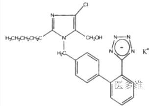 氯沙坦为合成的、强效口服活性药物。结合试验和药理学生物检测证明它能与AT1受体选择性结合。体内研究表明:氯沙坦及其具有药理活性的羧酸代谢产物(E−3174)可以阻断任何来源或任何途径合成的血管紧张素Ⅱ所产生的相应的生理作用。与其他肽类的血管紧张素Ⅱ拮抗剂相比,氯沙坦无激动作用。