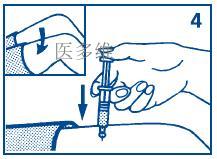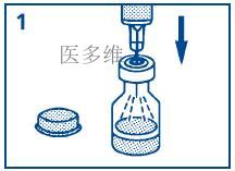 1.摘除溶剂瓶上的塑料帽。用一支一次性注射器吸尽瓶内溶剂。将针头透过橡胶塞(圆环标记内)插入装有高血糖素的药瓶中,将注射器内液体完全注入药瓶。