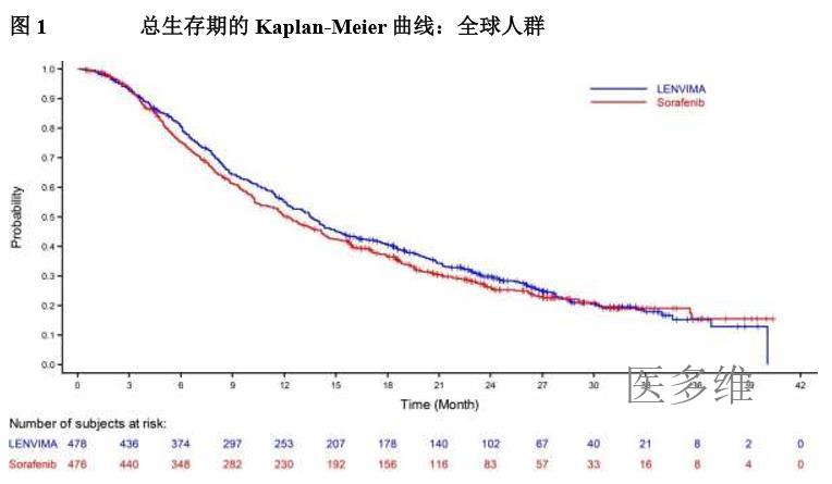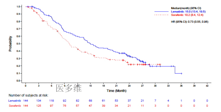 在一项不可切除肝细胞癌(HCC)患者的国际多中心、开放标签、随机3期研究(REFLECT)中评价了仑伐替尼的临床疗效和安全性。共954例患者以1:1的比例随机分组接受仑伐替尼(12mg[基线体重≥60kg]或8mg[基线体重<60kg]),每天1次口服,或索拉非尼400mg每天2次口服。肝功能状态为Child-Pugh A类且东部肿瘤协作组体能状态(ECOG PS)0或1的患者有资格入组。因晚期/不可切除HCC而进行了既往全身抗癌治疗或任何既往抗血管内皮生长因子(VEGF)治疗的患者被排除。既往接受放射疗法或局部治疗的靶病变必须有显示疾病进展的放射学证据。肝脏占位≥50%,影像显示明显侵袭至胆管或门静脉主干分支(Vp4)的患者也被排除。两个治疗组中大多数患者的基线ECOGPS为0(63%)、Child-Pugh评分为5(76%)且体重≥60kg(69%)。受试者的中位年龄为62岁,84%为男性,16%为女性,69%为亚洲人,29%为白人,1%为黑人。