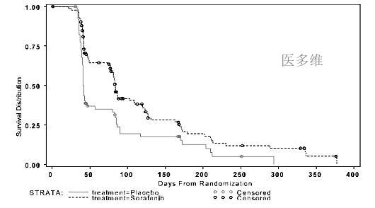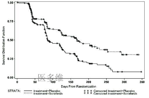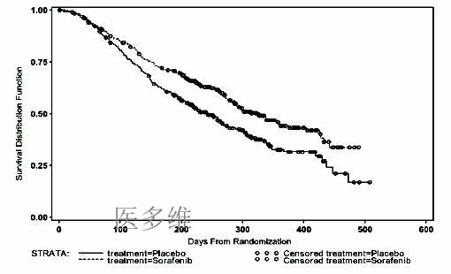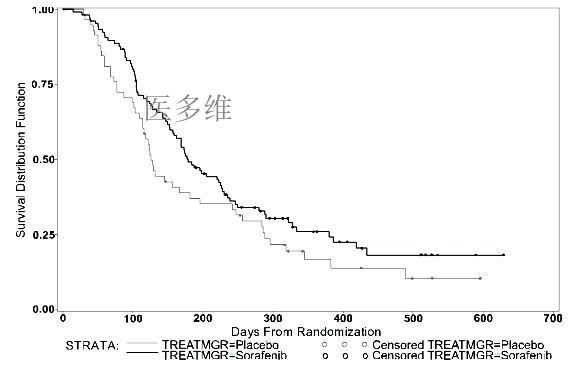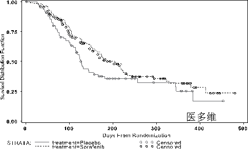 表3来自于试验11213中索拉非尼作为单一药物治疗的451位肾癌患者与451位使用安慰剂的肾癌患者(以白种人为主,包括少数非裔、亚裔、西班牙人及其他人种)。